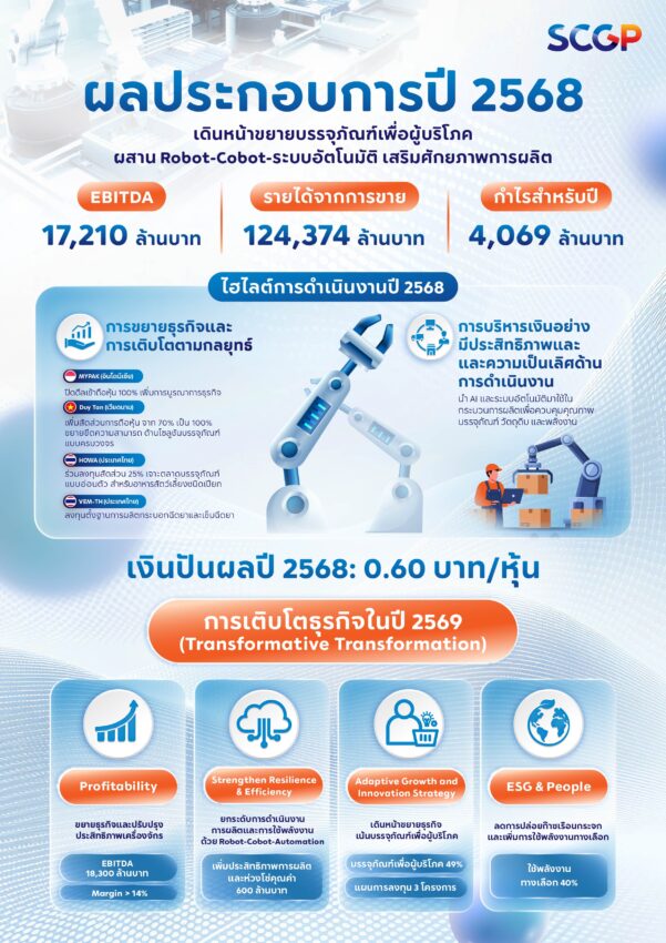 นอกจากนี้ SCGP ได้นำระบบอัตโนมัติ (Automation) เทคโนโลยีหุ่นยนต์ (Robot) และหุ่นยนต์เพื่อทำงานร่วมกับพนักงาน (Cobot) รวมทั้ง ระบบปัญญาประดิษฐ์ (Artificial Intelligence: AI) มาใช้ในกระบวนการผลิต เพื่อเพิ่มความแม่นยำในการควบคุมคุณภาพบรรจุภัณฑ์ ลดต้นทุน ตลอดจนช่วยในการจัดการวัตถุดิบ และส่งมอบสินค้าที่ได้คุณภาพให้ลูกค้า โดยจะขยายการใช้งานไปยังโรงงานในต่างประเทศต่อไป อีกทั้งยังเดินหน้าบริหารต้นทุนต่อเนื่อง เช่น ธุรกิจในอินโดนีเซียได้ปรับสัญญาการใช้พลังงาน ซึ่งจะเริ่มเห็นผลการลดค่าใช้จ่ายตั้งแต่เดือนมกราคม 2569 ทั้งนี้ SCGP วางแผนเพิ่มสัดส่วนการใช้พลังงานทางเลือกเป็นร้อยละ 40 จากร้อยละ 38 เพื่อลดการปล่อยก๊าซเรือนกระจก สอดคล้องกับการดำเนินงานภายในกรอบ ESG พร้อมลดต้นทุนโดยรวมของบริษัทฯ 600 ล้านบาทในปี 2569