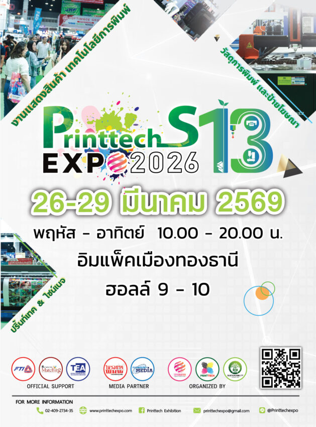 - งานแสดงสินค้าเทคโนโลยีการพิมพ์ วัสดุงานพิมพ์ และป้ายโฆษณา ครั้งที่ 13 ( The 13th PrintTech & Signage 2026) เป็นงานเปิดสู่โลกแห่งงานพิมพ์แบบครบวงจร พบกับเทคโนโลยี และนวัตกรรมใหม่ด้านงานพิมพ์ อาทิ กลุ่มเครื่องพิมพ์อิงค์เจ็ท กลุ่มเครื่องพิมพ์ดิจิตอล กลุ่มเครื่องซีเอ็นซี และกลุ่มธุรกิจบริการ เช่น งานป้ายโฆษณา ธุรกิจด้านงานพิมพ์ อุปกรณ์สำหรับงานพิมพ์ ธุรกิจด้านของขวัญของชำร่วย เครื่องพิมพ์บนวัสดุ เครื่องพิมพ์บนผ้า กลุ่มงานสกรีน และอื่นๆ มีโปรโมชั่นสินค้า ลด แลก แจก แถม จากผู้ประกอบการตรง ด้วยแนวคิด ” ลดต้นทุน เพิ่มประสิทธิภาพ เพิ่มกำไร”